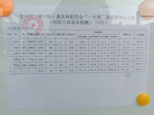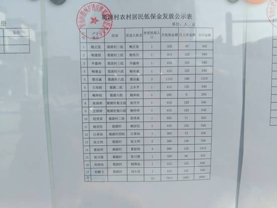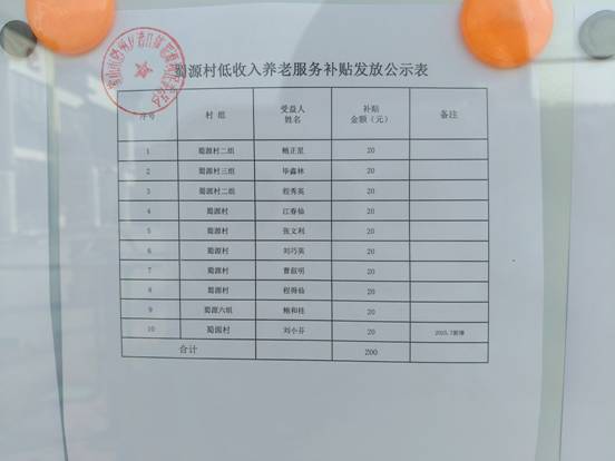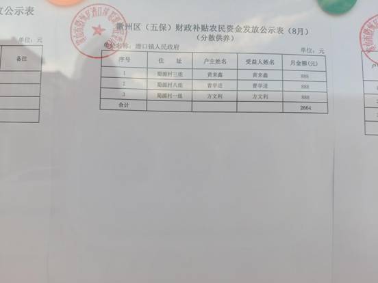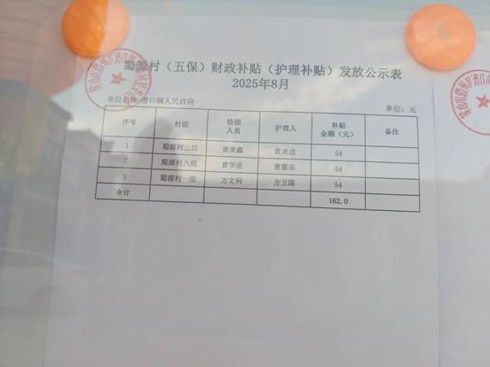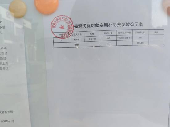 蜀源村8月五保分散供养财政补贴农民资金发放公示