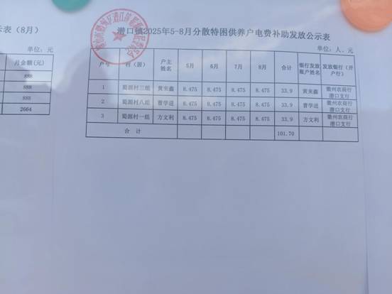 蜀源村5-8月分散特困供养户电费补助发放公示