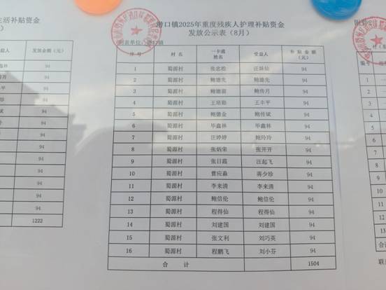 蜀源村8月重度残疾人护理补贴资金发放公示