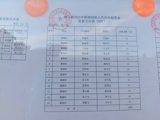 蜀源村8月困难残疾人生活补贴资金发放公示