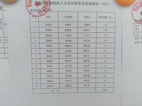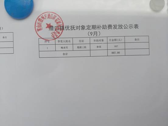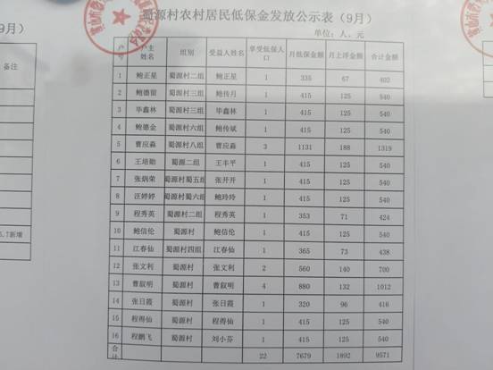 9月农村居民低保金发放公示
