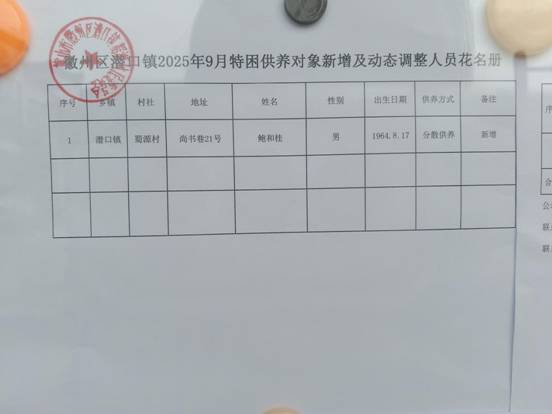 9月特困供养对象新增及动态调整人员公示