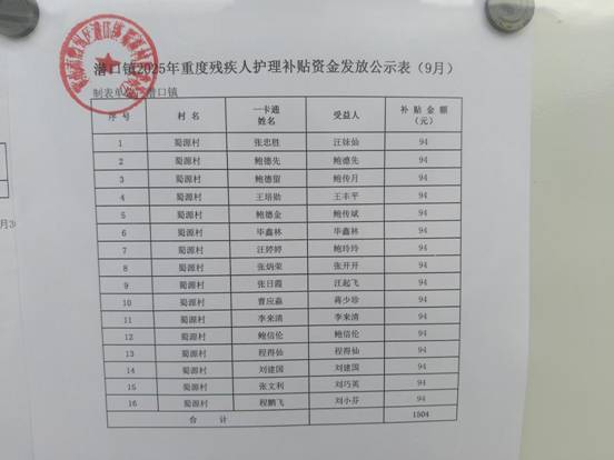 9月重度残疾人护理补贴资金发放公示表