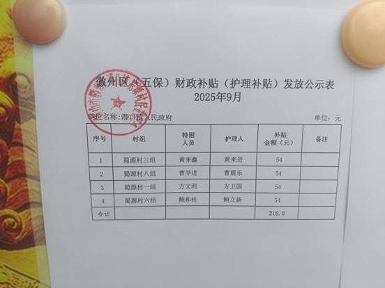 9月五保财政护理补贴发放公示