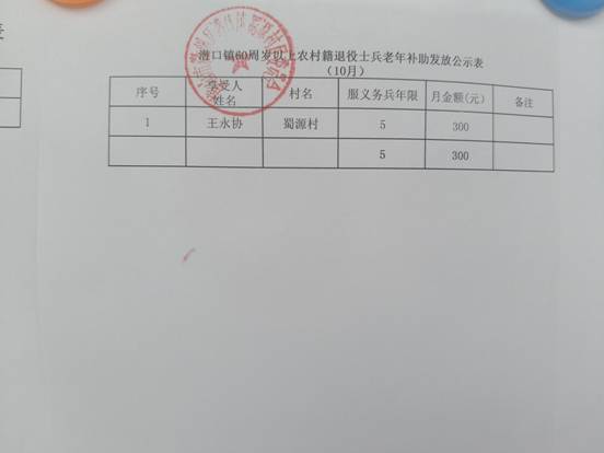 蜀源村10月60周岁以上农村籍退役士兵老年补助发放公示