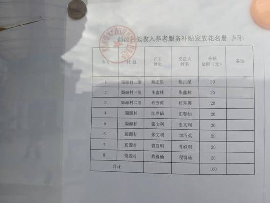蜀源村10月份低收入养老服务补贴发放公示