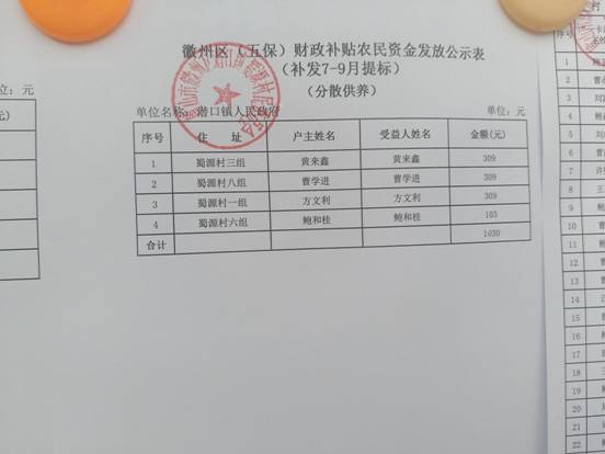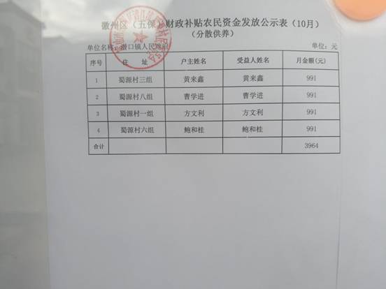 蜀源村10月五保分散供养财政补贴农民资金发放公示