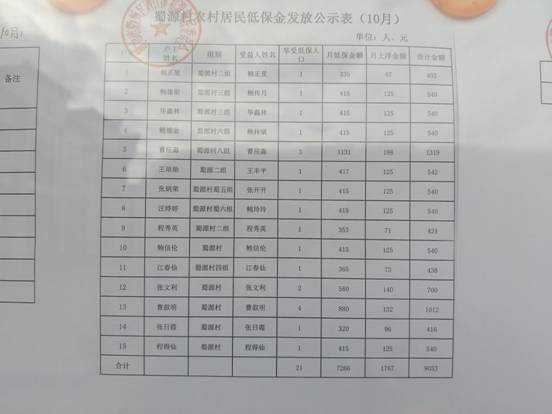 蜀源村10月农村居民低保金发放公示表