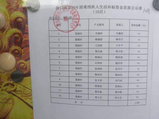 蜀源村10月困难残疾人生活补贴资金发放公示