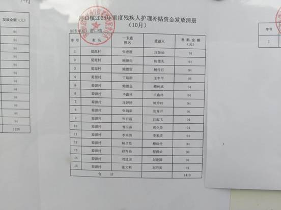 蜀源村10月重度残疾人护理补贴资金发放公示