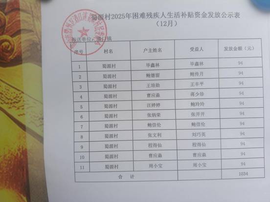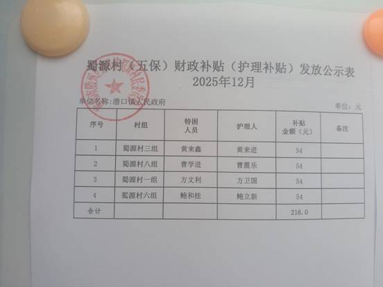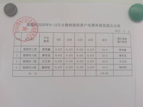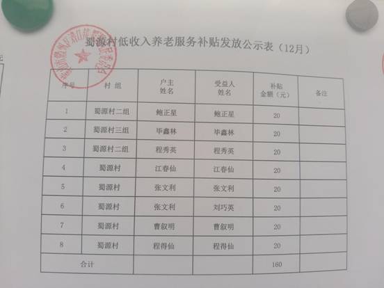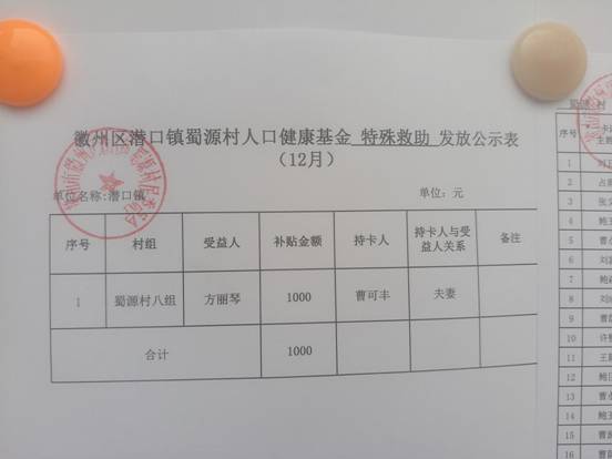 12月蜀源村人口健康基金特殊救助发放公示