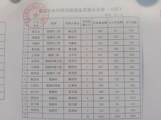 12月农村居民低保金发放公示