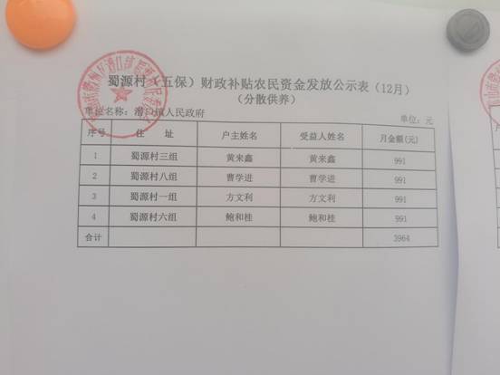 12月五保分散供养财政补贴资金发放公示