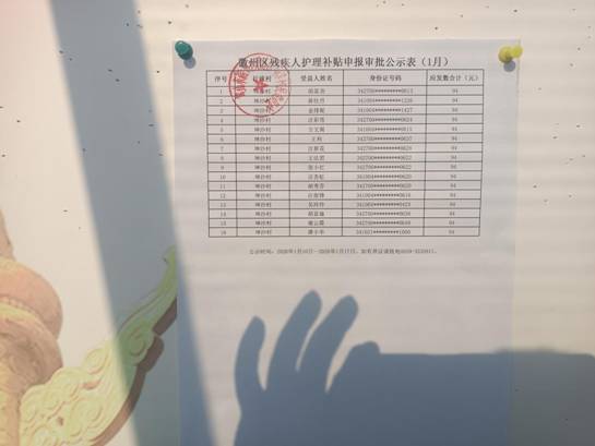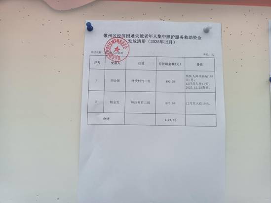 徽州区经济困难失能老年人集中照护服务救助资金发放公示