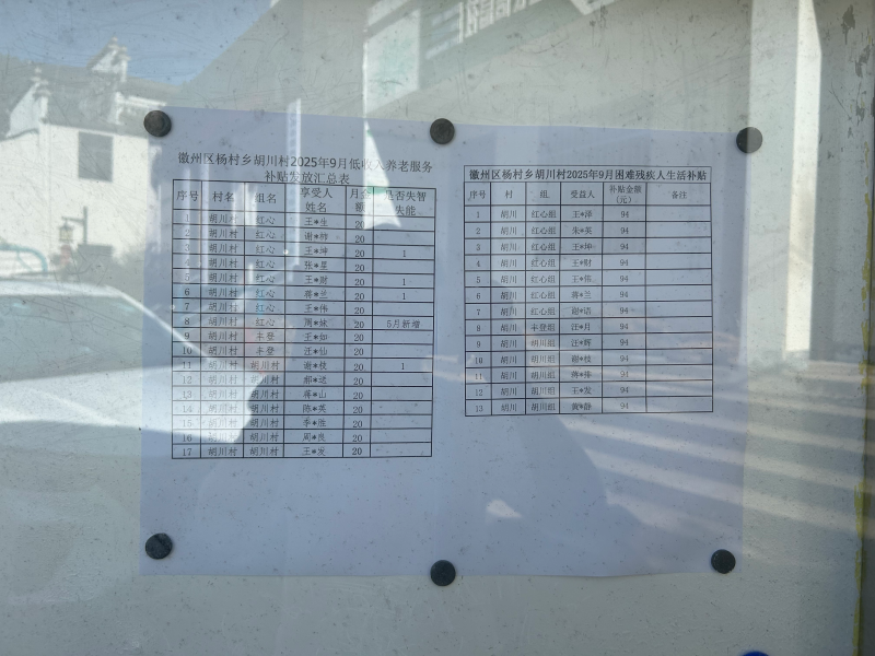 杨村乡胡川村2025年9月困难残疾人生活补贴公示