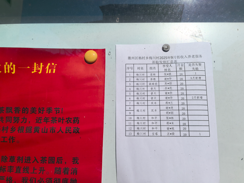 杨村乡梅川村2025年9月低收入养老服务补贴发放汇总表