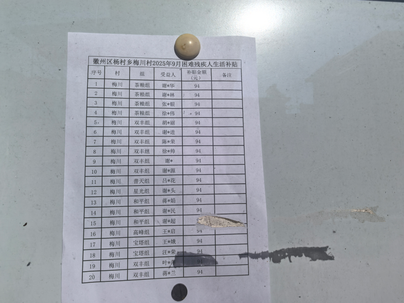 杨村乡梅川村2025年9月困难残疾人生活补贴公示