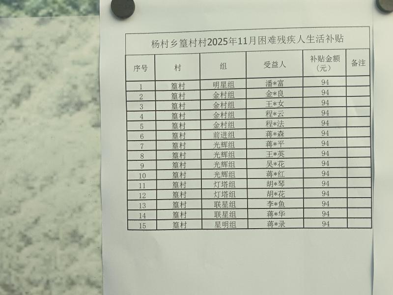 2025年11月困难残疾人生活补贴公示