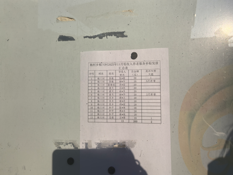 杨村乡梅川村2025年11月低收入养老服务补贴发放汇总表