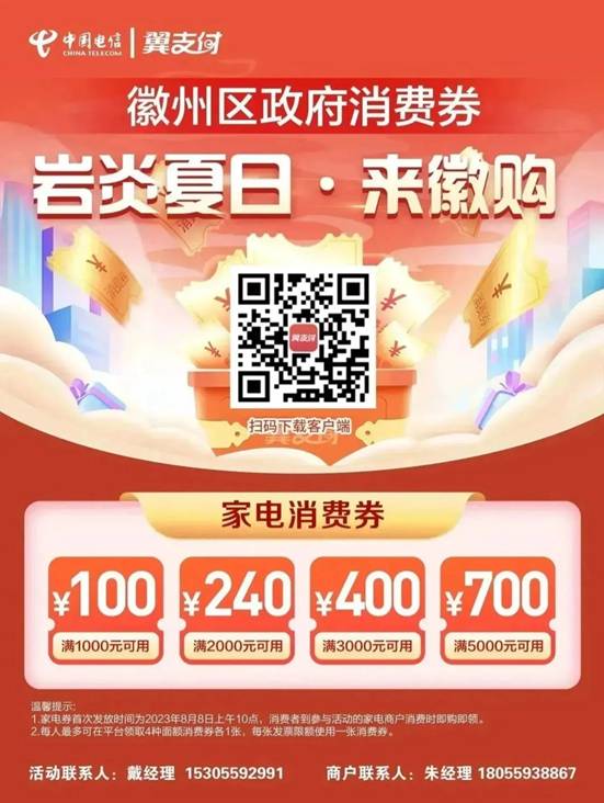 消费券领取:消费者下载安装翼支付app,通过翼支付APP首页进入徽州区消费券活动主会场抢消费券。