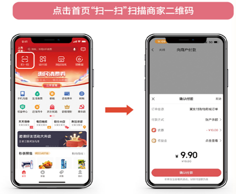 消费券核销:消费者到参加活动的商户消费时,通过“翼支付APP”线下出示付款码进行支付,满足消费券使用金额条件,消费券自动核销。