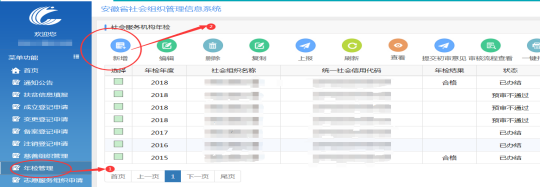 ②用户登录跳转到“安徽省社会组织管理信息系统,à点击左侧菜单“年检管理”,à新增。
