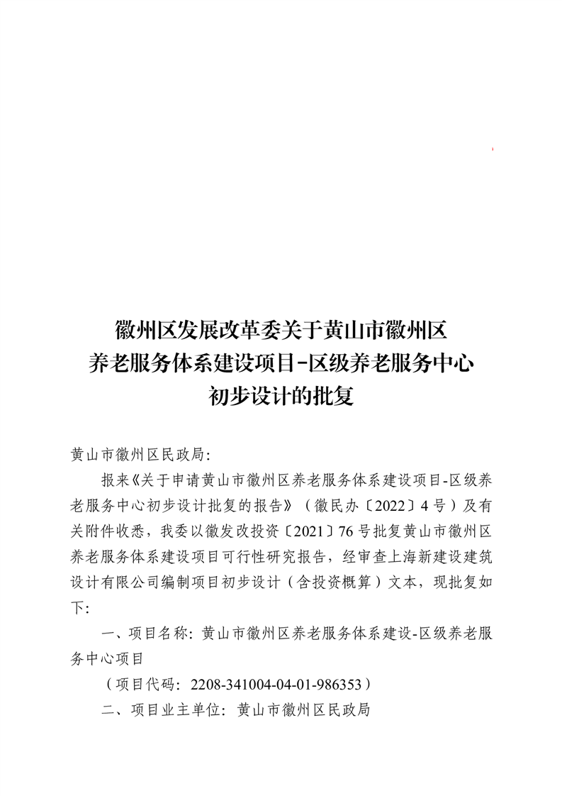 【批准结果】徽州区发展改革委关于黄山市徽州区养老服务体系建设项目-区级养老服务中心初步设计的批复