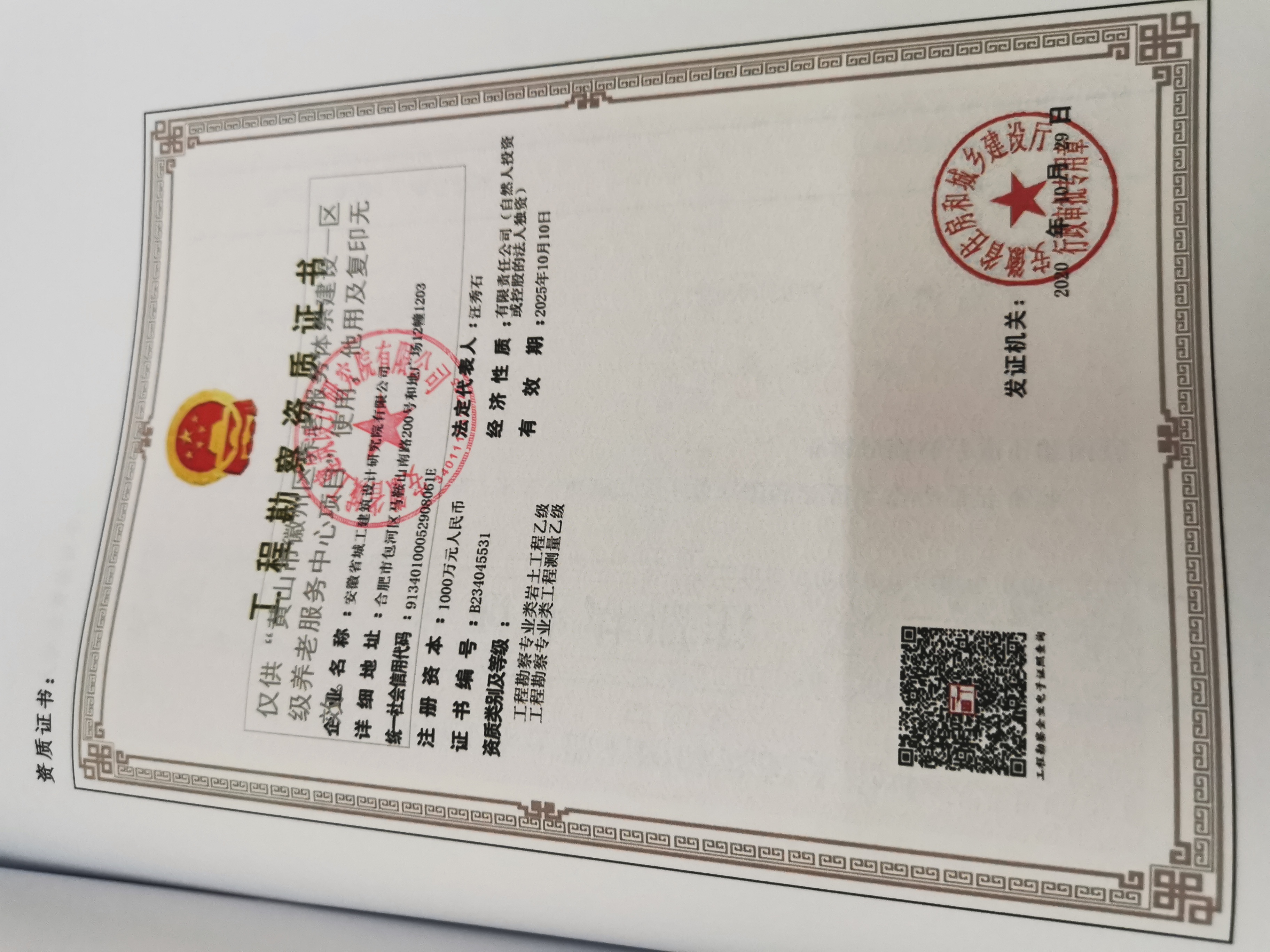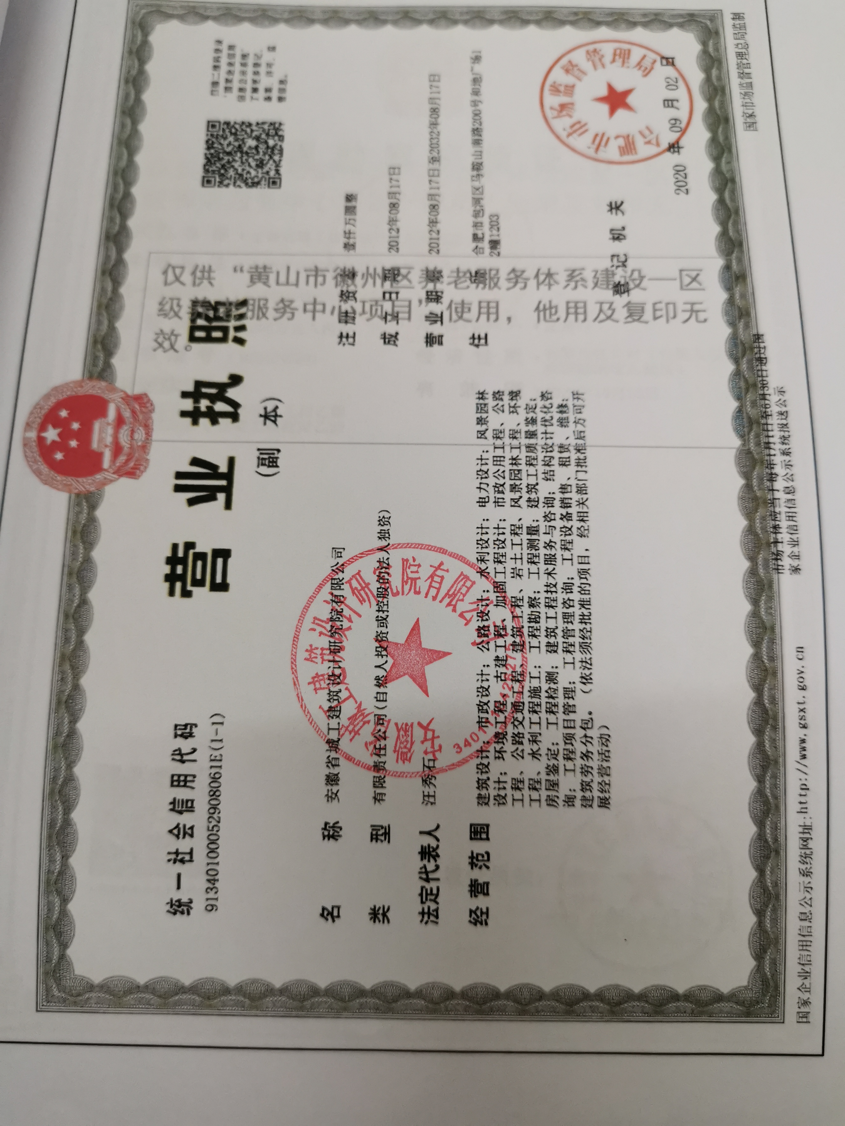 【施工信息】黄山市徽州区养老服务体系建设——区级养老服务中心工程施工营业执照