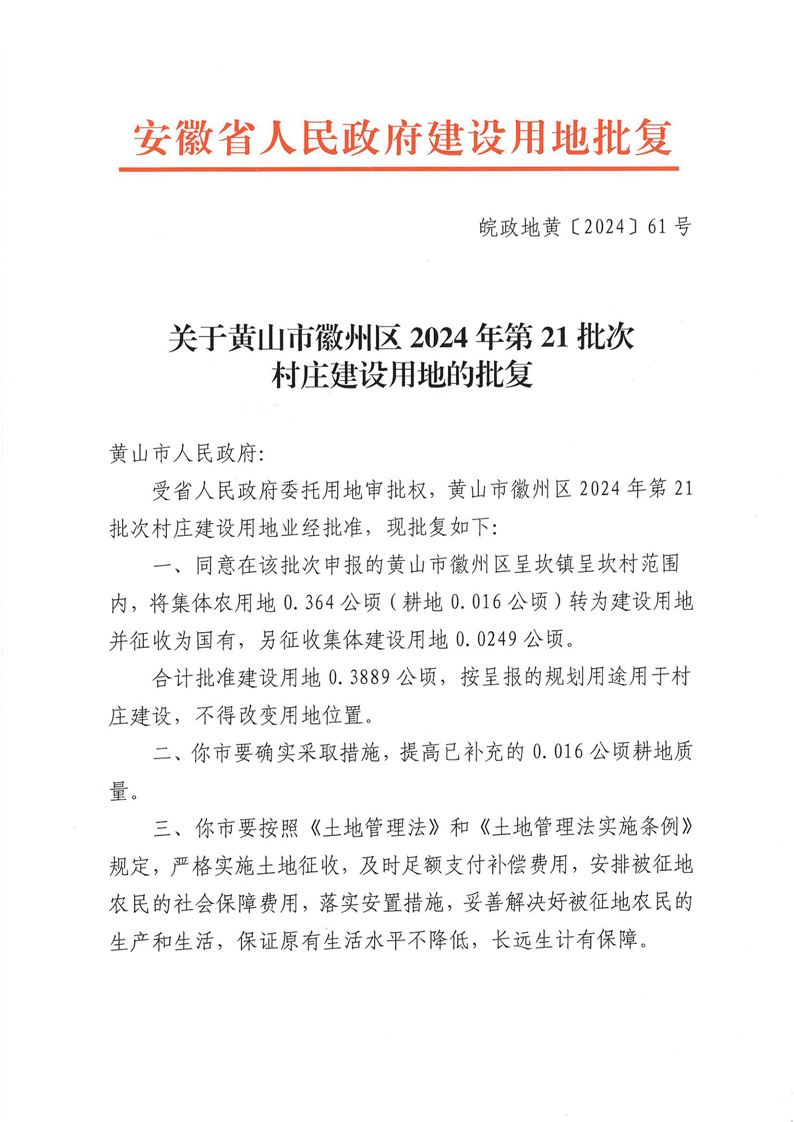 关于黄山市徽州区2024年第21批次村庄建设用地的批复