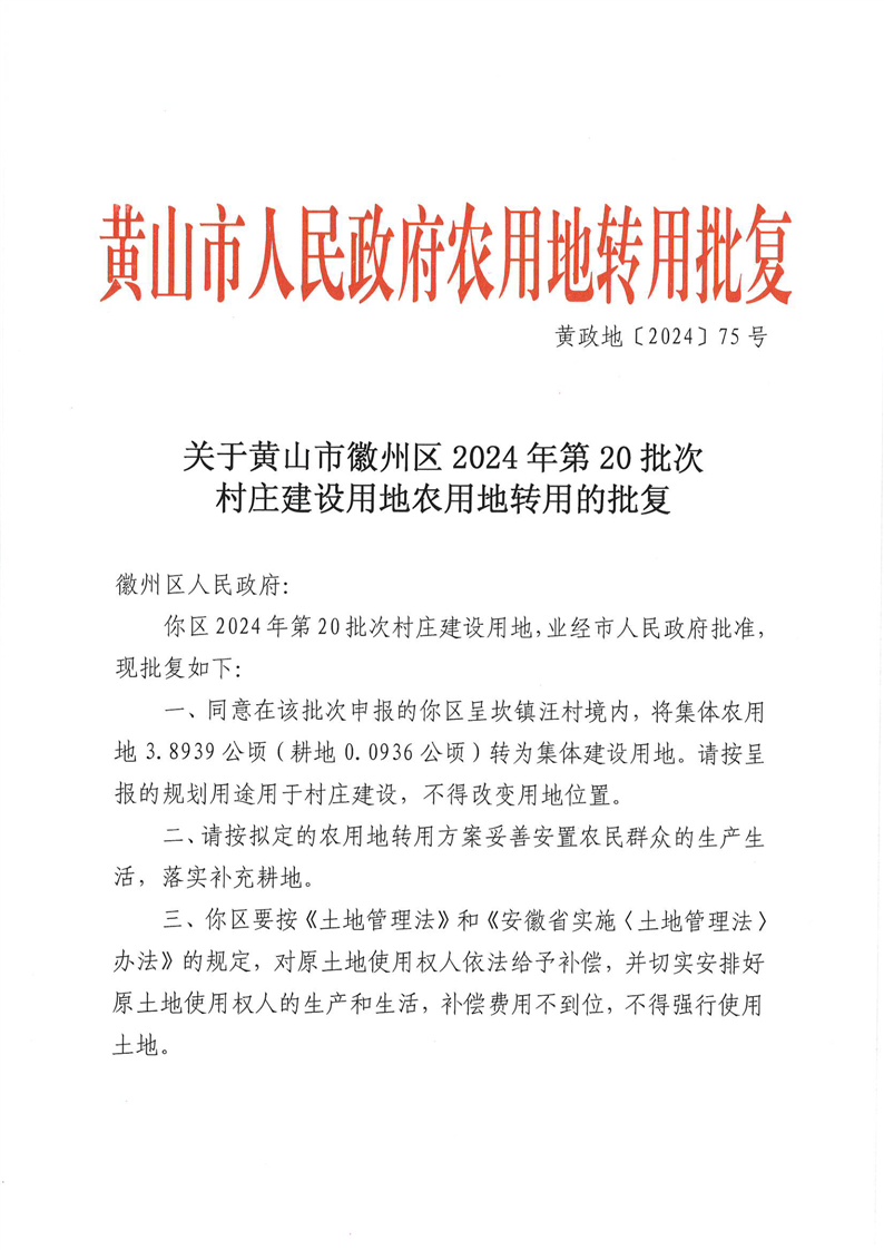 关于黄山市徽州区2024年第20批次村庄建设用地农用地转用的批复