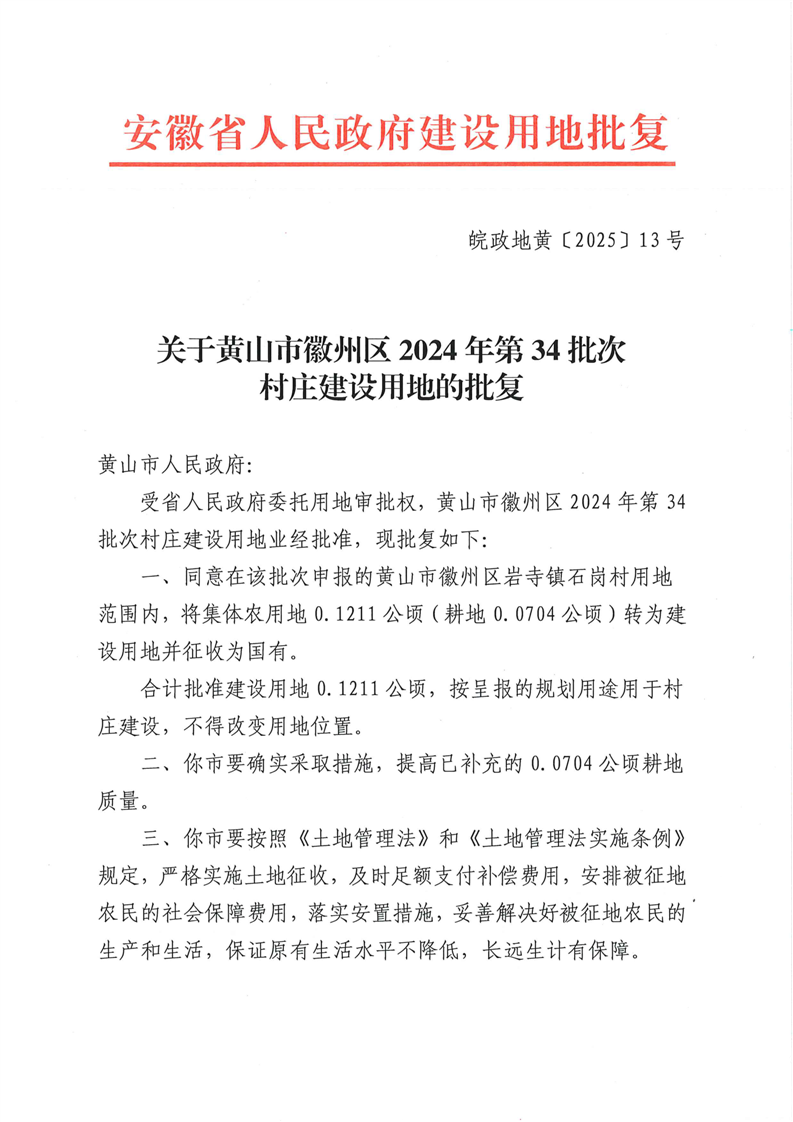 关于黄山市徽州区2024年第34批次村庄建设用地的批复