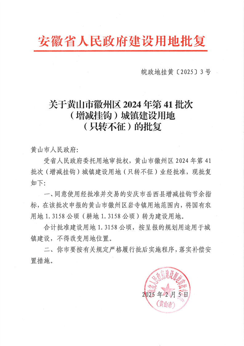 关于黄山市徽州区2024年第41批次(增减挂钩)城镇建设用地(只转不征)的批复