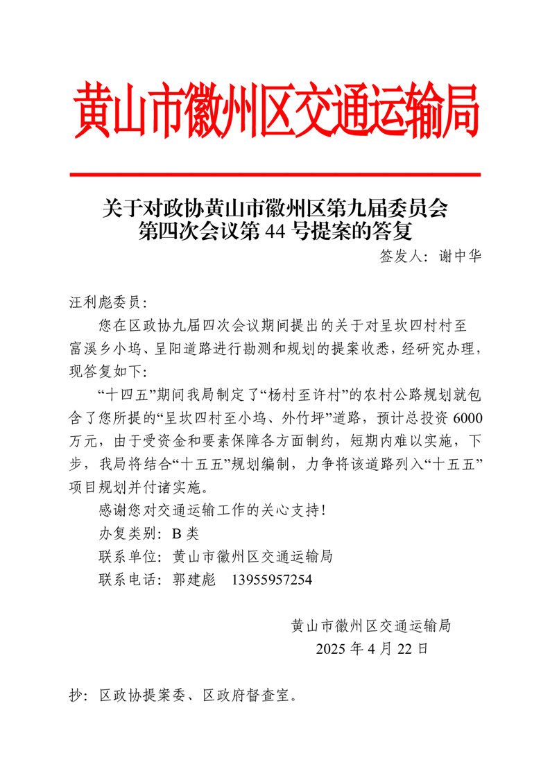 关于对政协黄山市徽州区第九届委员会第四次会议第44号提案的答复