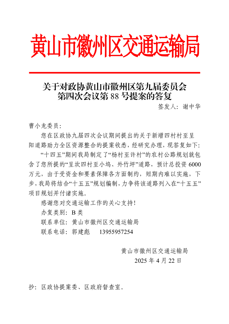 关于对政协黄山市徽州区第九届委员会第四次会议第88号提案的答复