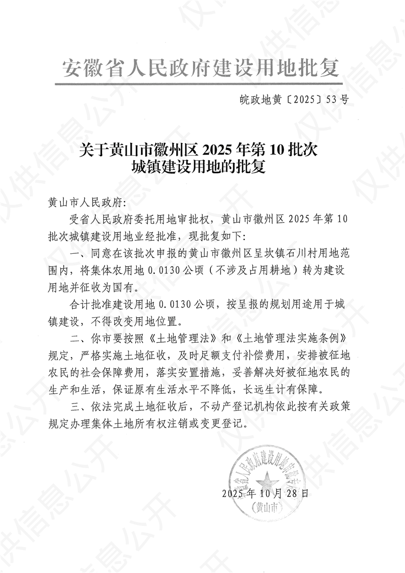 关于黄山市徽州区2025年第10批次城镇建设用地的批复