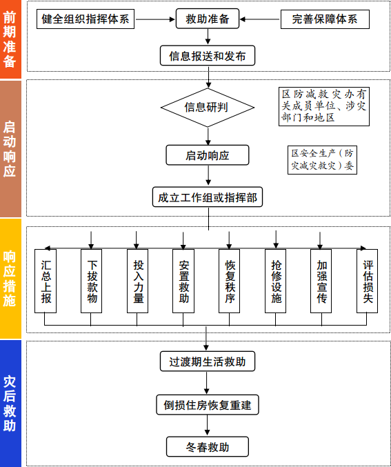 区安全生产(防灾减灾救灾)委办公室组织协调区级层面自然灾害救助工作,指导支持受灾地区自然灾害救助工作。区安全生产(防灾减灾救灾)委及其成员单位视情采取以下措施: