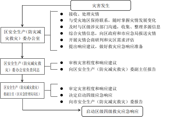 灾害发生后,区安全生产(防灾减灾救灾)委办公室在接到灾情报告后经分析评估,认定灾情达到启动标准,区安全生产(防灾减灾救灾)委副主任(区应急局局长)决定启动四级响应,向市安全生产(防灾减灾救灾)委报告。