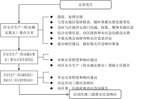 灾害发生后,区安全生产(防灾减灾救灾)委办公室在接到灾情报告后经分析评估,认定灾情达到启动标准,区安全生产(防灾减灾救灾)委副主任(区应急局局长)决定启动三级响应,并向区委、区政府和市安全生产(防灾减灾救灾)委报告。