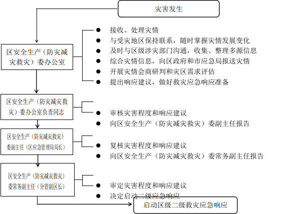 灾害发生后,区安全生产(防灾减灾救灾)委办公室在接到灾情报告后经分析评估,认定灾情达到启动标准,向区安全生产(防灾减灾救灾)委提出启动二级响应的建议,由区安全生产(防灾减灾救灾)委常务副主任决定启动二级响应,并向区委区政府和市安全生产(防灾减灾救灾)委报告。