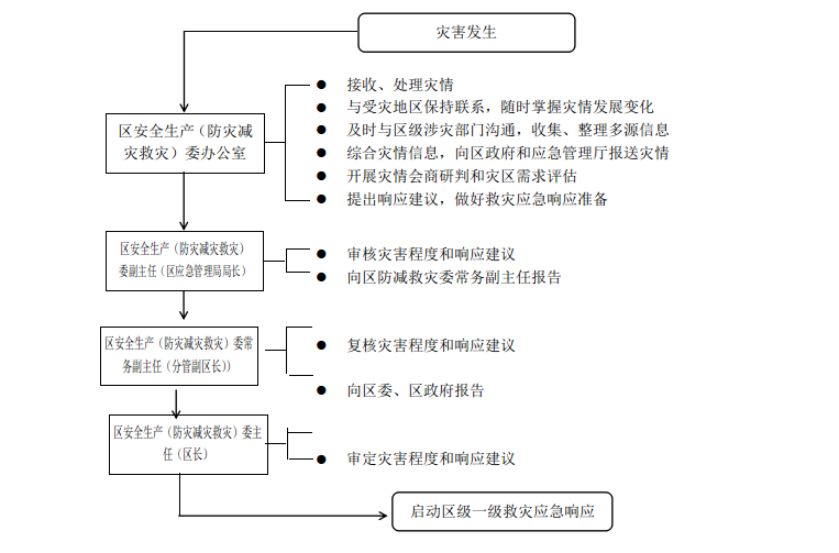 灾害发生后,区安全生产(防灾减灾救灾)委办公室在接到灾情报告后经分析评估,认定灾情达到启动标准,向区安全生产(防灾减灾救灾)委提出启动一级响应的建议,按照区委区政府决定,启动一级响应,并向市安全生产(防灾减灾救灾)委报告。