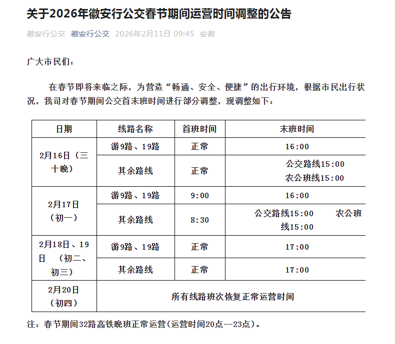 徽州区公交春节期间运营时间调整