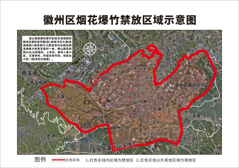 第五条 禁止燃放烟花爆竹区域:东至皖赣铁路及区循环经济园(含);南至丰乐大道(快速通道);西至信行三路至滨河北路至西溪南新大桥至芝篁村一线、南山路至卯田以北;北至瑶村、上朱村、徽州人家小区、文峰学校、井信农贸市场、尚紫台小区一线(详见示意图)。