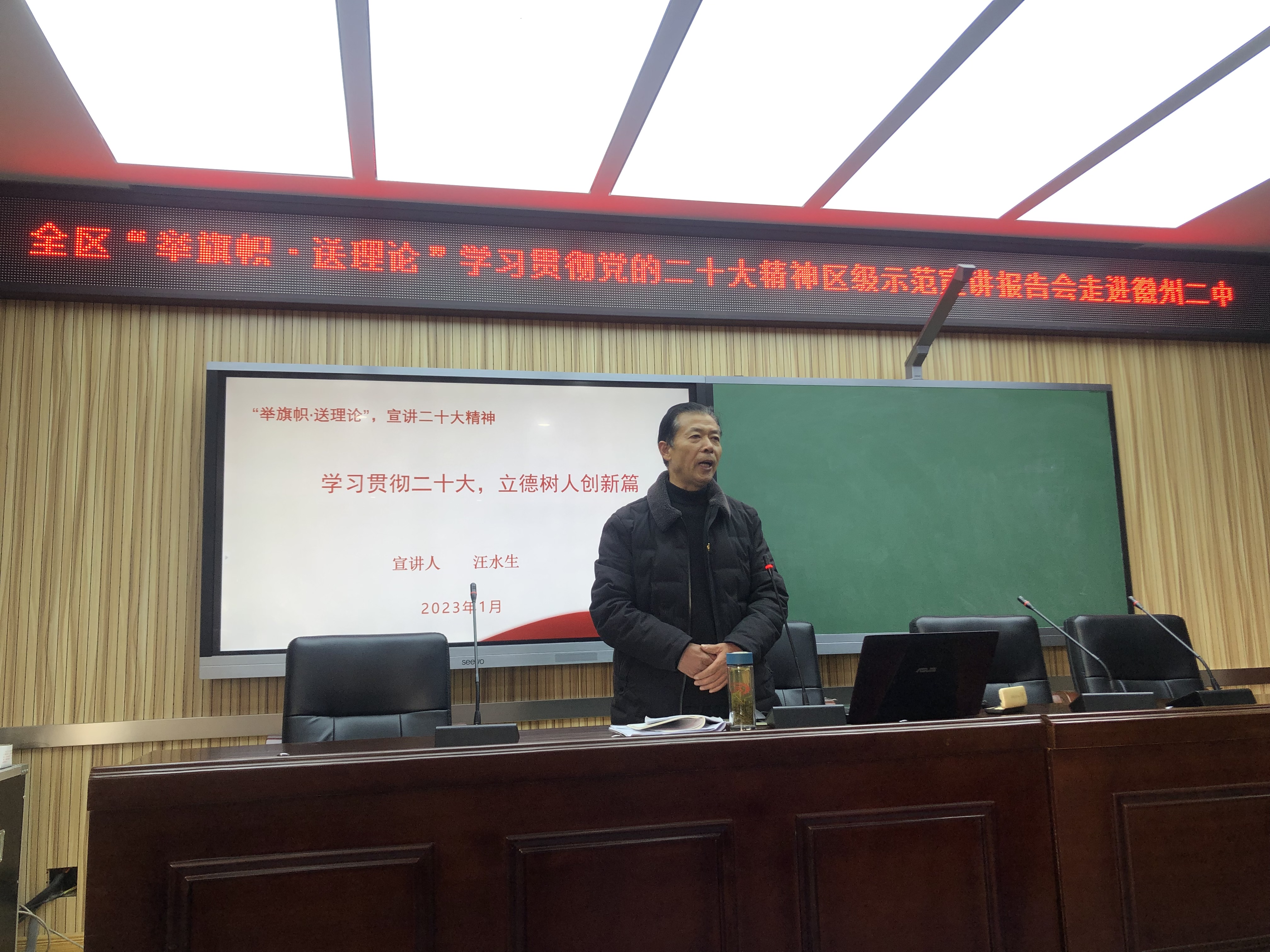 为进一步学习党的二十大精神,培养教师队伍立德创新精神,打造高质量教师团队。1月7日,全区“举旗帜·送理论”学习贯彻党的二十大精神区级示范宣讲报告会走进徽州二中,宣讲人徽州二中退休高级教师汪水生作宣讲报告,全体教师参加会议。