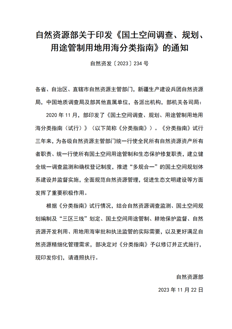 自然资源部关于印发《国土空间调查、规划、用途管制用地用海分类指南》的通知