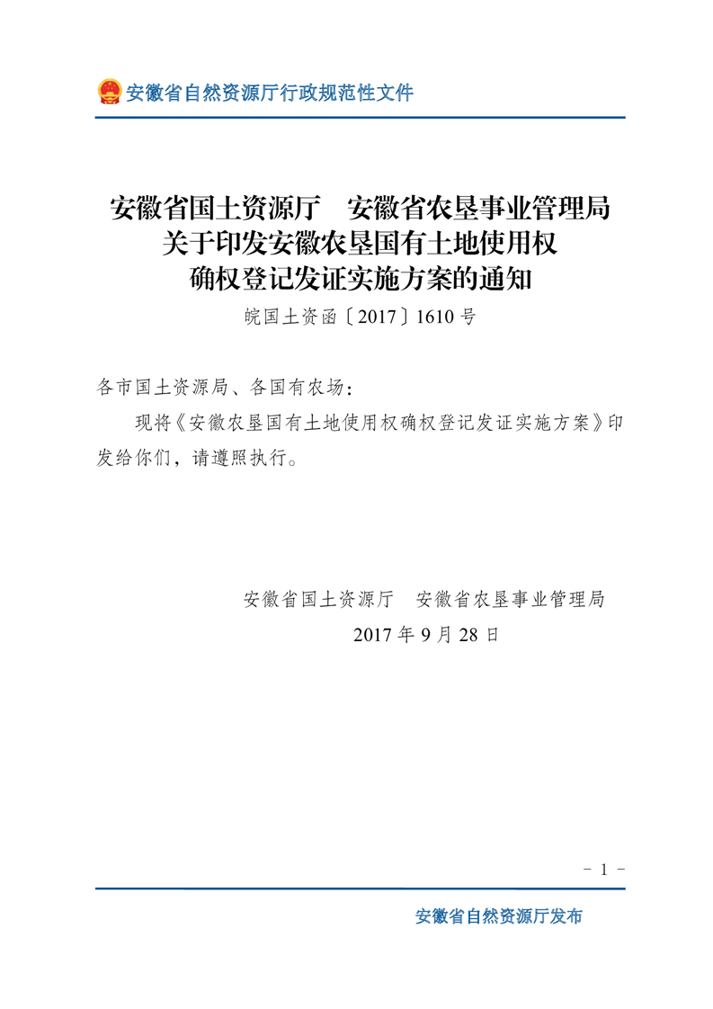 安徽省国土资源厅 安徽省农垦事业管理局关于印发安徽农垦国有土地使用权确权登记发证实施方案的通知