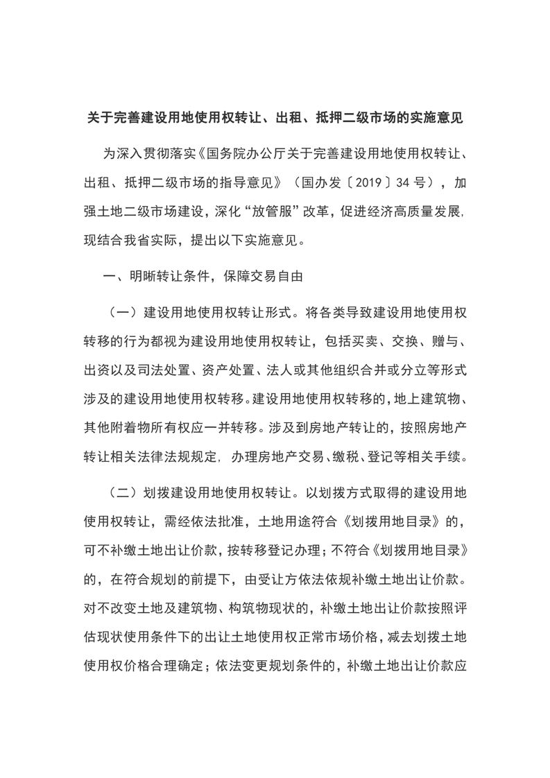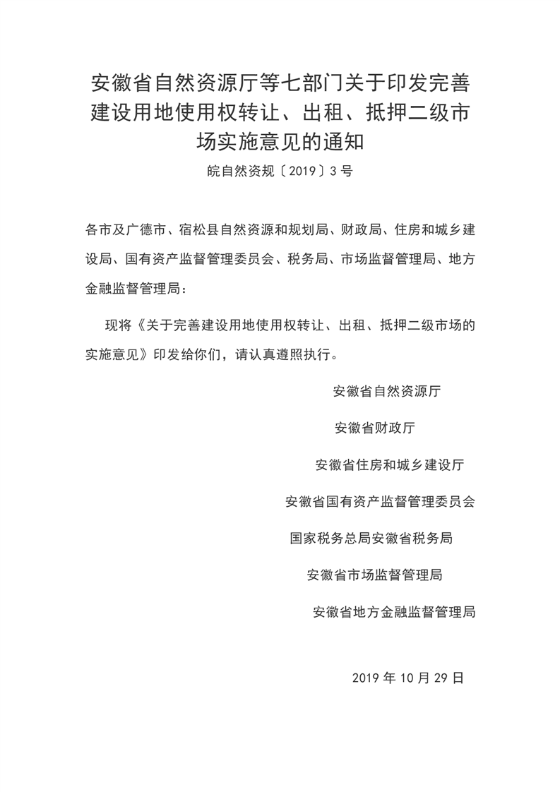 安徽省自然资源厅等七部门关于印发完善建设用地使用权转让、出租、抵押二级市场实施意见的通知