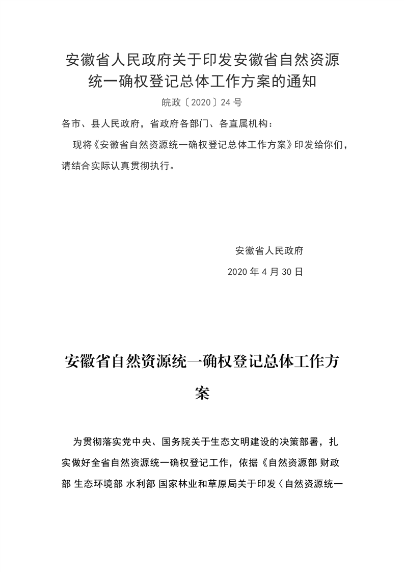 安徽省人民政府关于印发安徽省自然资源统一确权登记总体工作方案的通知