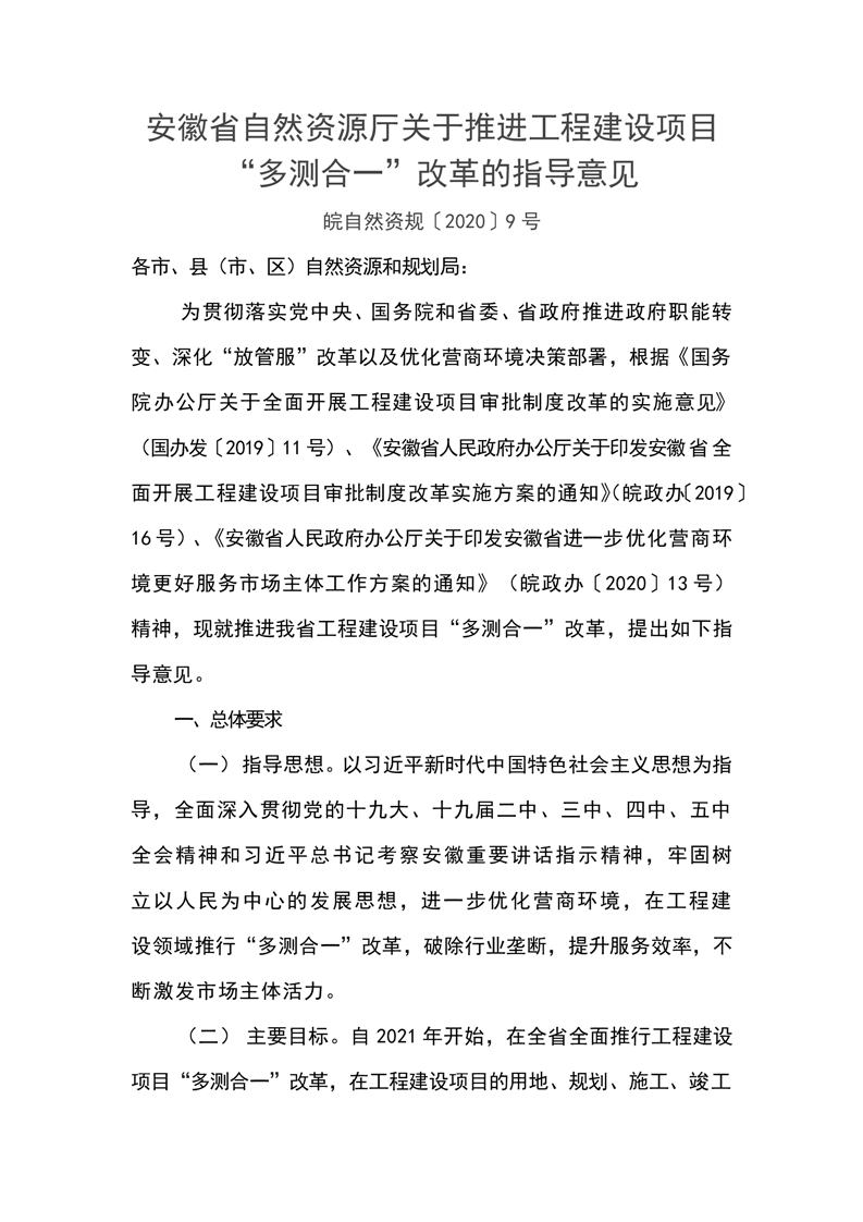 安徽省自然资源厅关于推进工程建设项目“多测合一”改革的指导意见