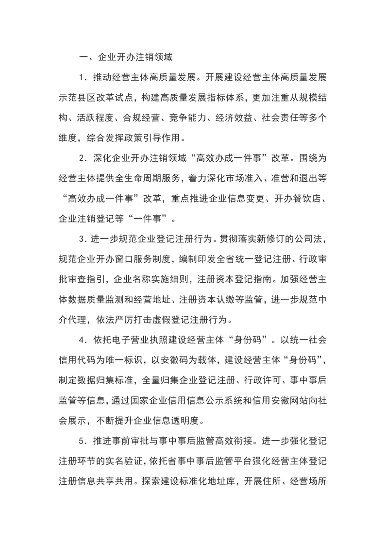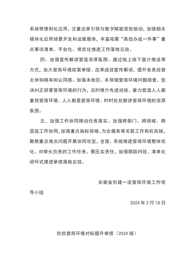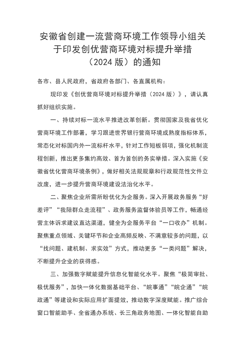安徽省创建一流营商环境工作领导小组关于印发创优营商环境对标提升举措(2024版)的通知
