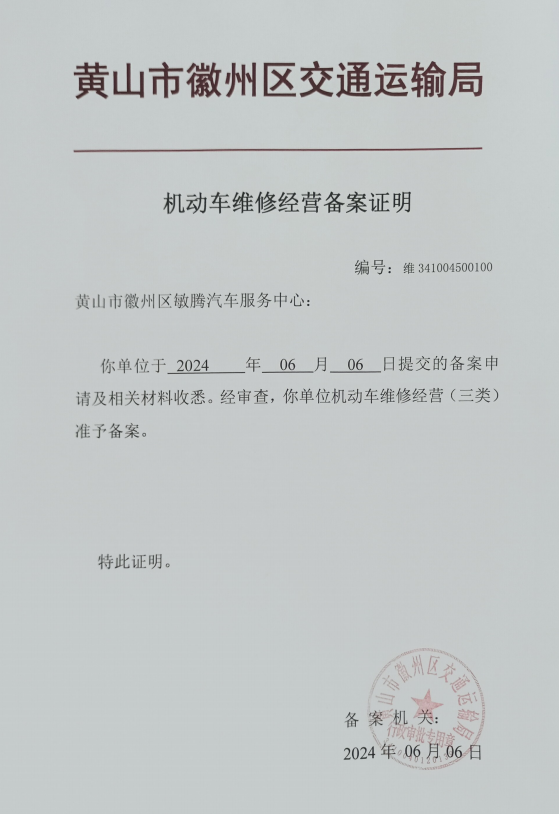 机动车维修经营备案(维:341004500100)